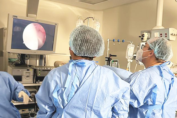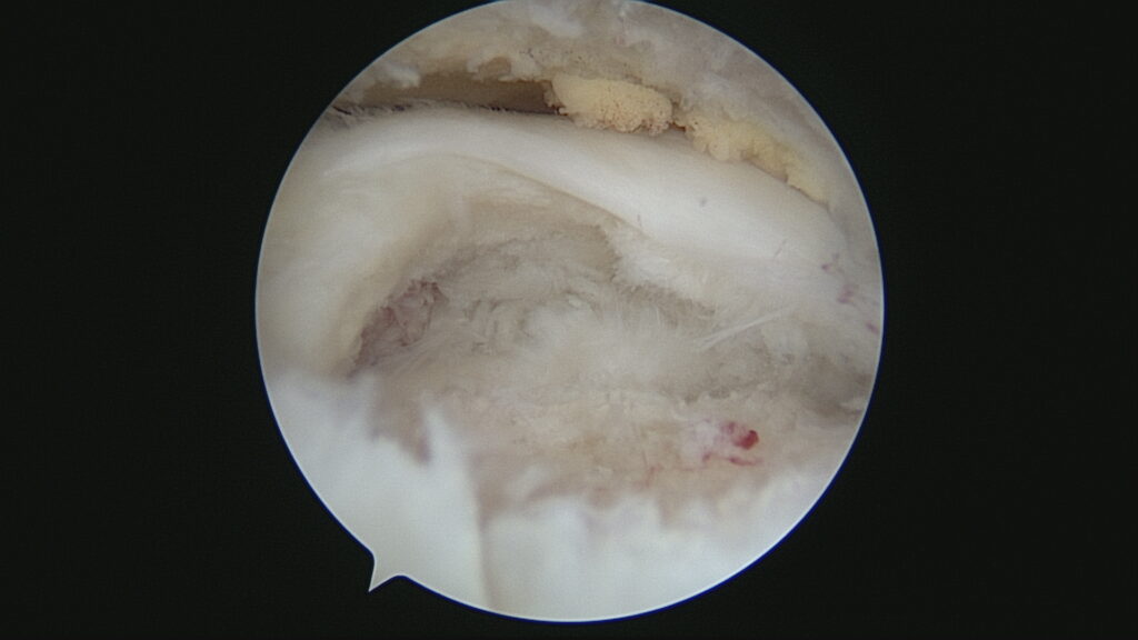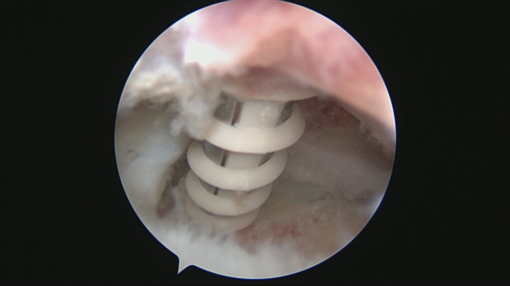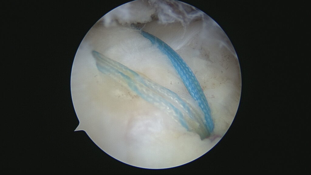 Cirugía mínimamente invasiva con el apoyo de video. Mediante pequeñas incisiones se pueden resolver problemas de roturas tendinosas y lesiones ligamentarias de la articulación.
